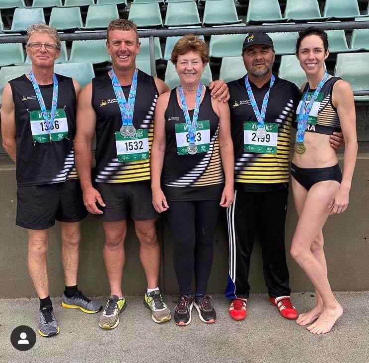 Masters thrower Kerrie Jones was as pleased as punch to come away with three silver medals. Kerrie said “it was hard going” and she “had never thrown in conditions as bad as that” so she was “extra thrilled with the result”. Kerrie threw 22.37m in hammer for second place in the 65-69 years event; attributing the extra hammer practice at Wednesday night athletics for helping her reach her goals. Kerrie also threw 6.65m in shot and 15.67m in discus for silver medals.
