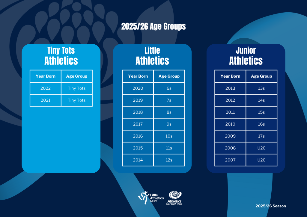 Age groups for membership categories/costs are determined by Athletics NSW. Following widespread feedback from the community, NSW Athletics has simplified the age group terminology for junior athletics across the state for the 2025/2026 season. These changes aim to provide greater clarity and consistency for athletes, parents, and clubs. The double-barrelled age group names (e.g. “13’s (U14)”) have been replaced with simplified terminology such as “13s,” “14s,” etc.
