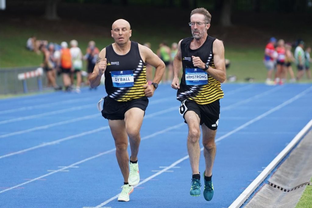 It’s not often that 2 athletes in the same age-group from the same Club have such closely contested races – with each other! However, this was the exact case for Gavin Dyball and Scott Armstrong. In the 50-59 years 1500m, both Gavin and Scott had a great race, swapping the lead with each other a couple of times. Both dug deep and pushed each other all the way to the line with Scott taking the win in 5.01.16 in front of Gavin who clocked a huge PB of 5.03.08. In the 800m on Sunday, the race played out similarly with another great tussle. This time the results were reversed and Gavin surged on the line to take the win in 2.26.34 followed by Scott in 2.26.45. It was racing at its best and definitely a highlight of the meet.