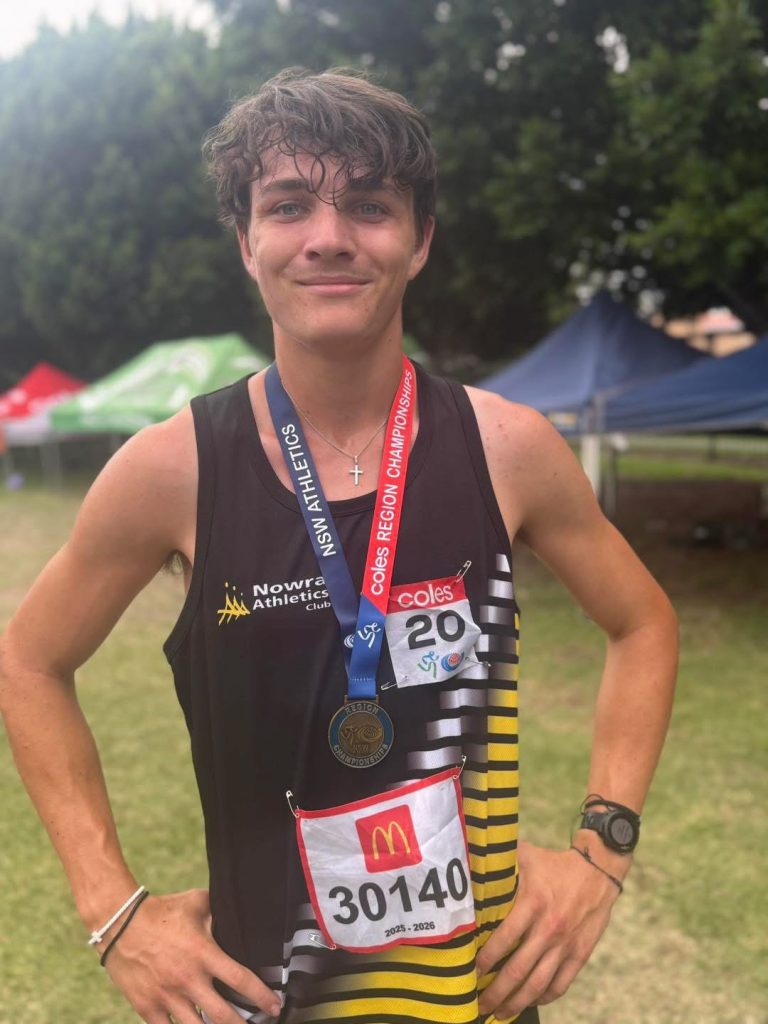 Lana Crawford had a strong win in the 15 years 1500m, clocking 5.08.29, well ahead of second placegetter Natalia Hall from Kembla Joggers in 5.15.45. Nowra’s Madeline Oke was next across the line in 5.20.48 to claim the bronze medal.