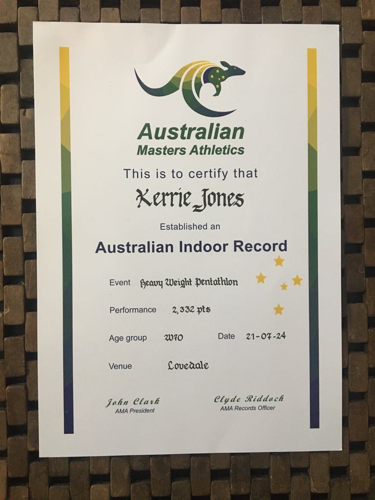 To top off a very successful weekend of competition, Kerrie returned home to find the certificate for her Australian Indoor Record for the Heavy Weight Pentathlon which she set back in July, waiting for her.