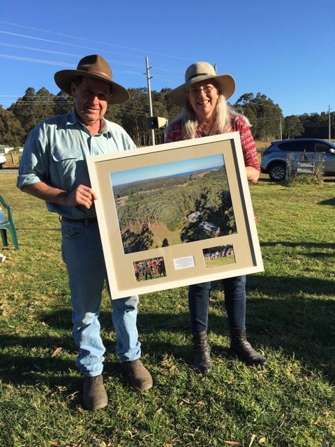 The Nowra Athletics Club committee presented property owners Ron and Ruth McKinnon with a framed photograph memento of Timberhills as a thank you to them, along with Steve McKinnon and their late father Bill, for developing the course and allowing the Club to use it over a long history. The Club is eternally grateful for the contribution the McKinnon family have made to cross country.